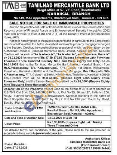 Vacant Land to the extent of 3615 sq.ft situated at R.S.79/2 Old S. No 296, 248/28, 248/1c pt, Plot No.35, 36 and 37, Patta No. 256 No 22, Subrayapuram Village, Subrayapuram, Karaikal standing in the name of Mrs. P. Boopathi, Boundaries: North by: Site in R.S No.79/2 part, South by: Road, East by: Plot No. 38, West by: Plot No.34