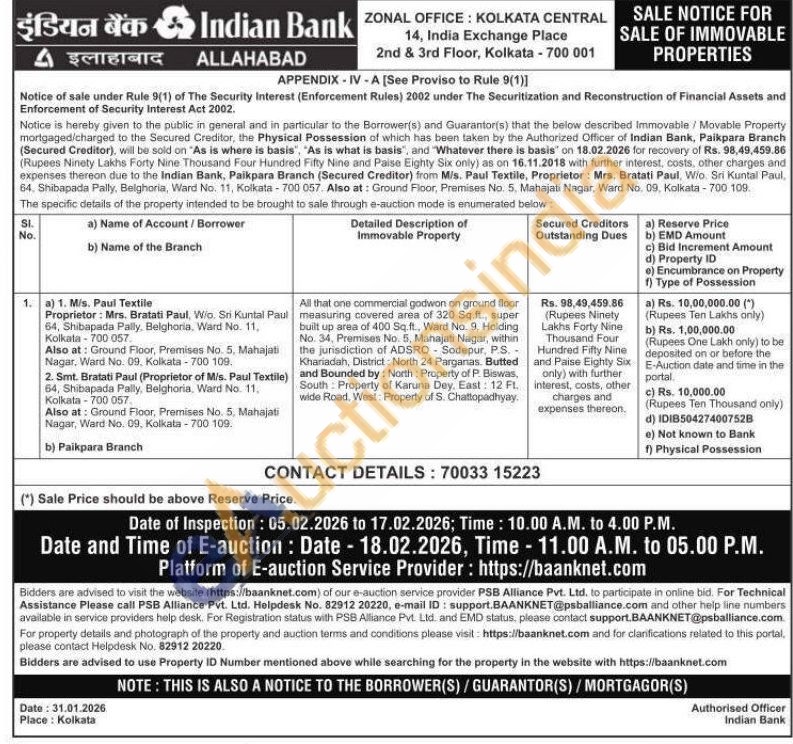 All that one commercial godwon on ground floor measuring covered area of 320 Sq.ft, super built up area of 400 Sq.ft., Ward No. 9, Holding No. 34, Premises No. 5. Mahajati Nagar, within the jurisdiction of ADSRO Sodepur, P.S. Khariadah, District: North 24 Parganas. Butted and Bounded by: North: Property of P. Biswas, South Property of Karuna Dey, East: 12 Ft. wide Road, West: Property of S. Chattopadhyay.