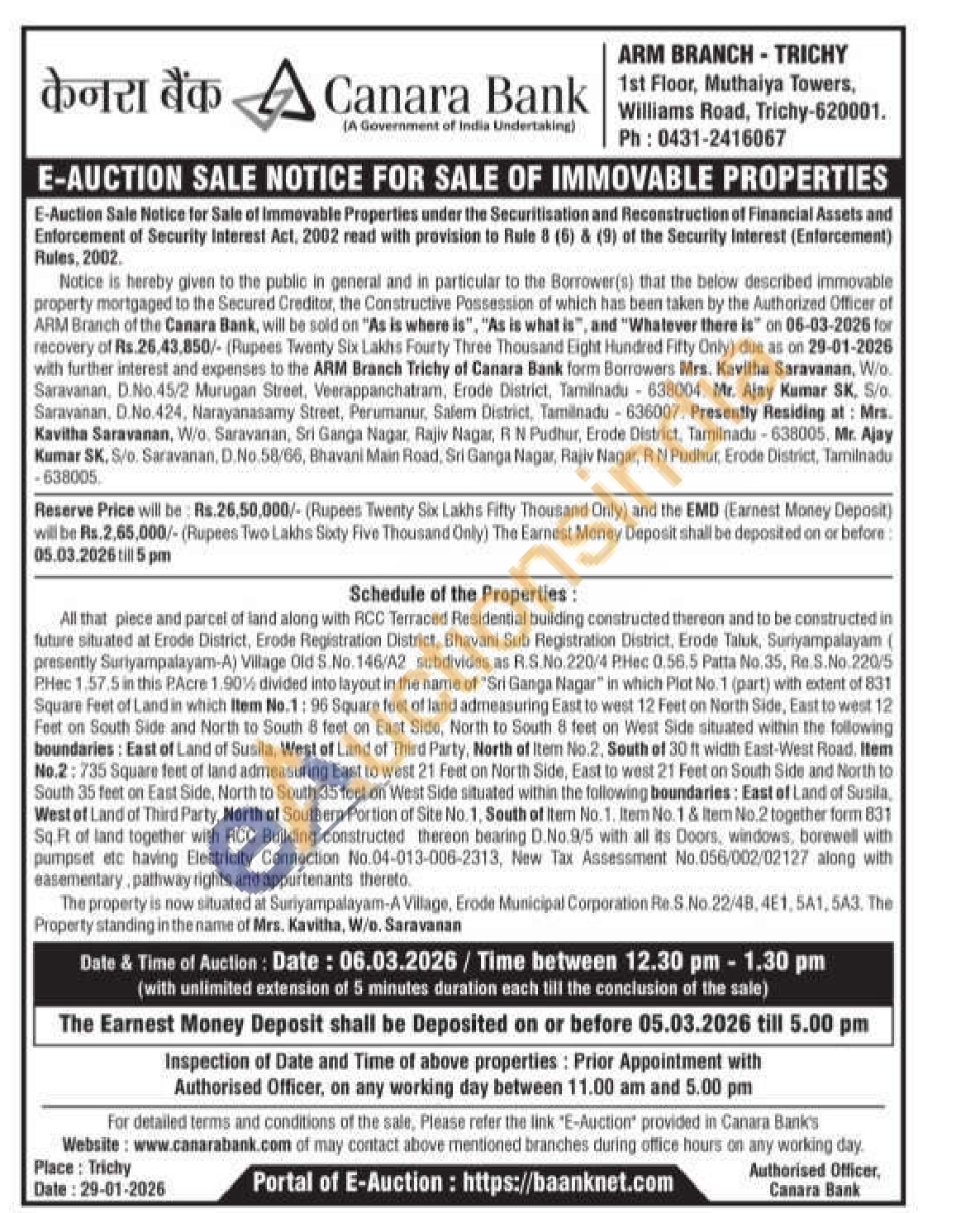 All that piece and parcel of land along with RCC Terraced Residential building constructed thereon and to be constructed in future situated at Erode District, Erode Registration District, Bhavani Sub Registration District, Erode Taluk, Suriyampalayam ( presently Suriyampalayam-A) Village Old S.No. 146/A2 subdivides as R.S.No.220/4 P.Hec 0.56.5 Patta No.35, Re.S.No. 220/5 PHec 1.57.5 in this PAcre 1.90% divided into layout in the name of "Sri Ganga Nagar" in which Plot No. 1 (part) with extent of 831 Square feet of Land in which Item No.1: 96 Square feet of land admeasuring East to west 12 Feet on North Side, East to west 12 Feet on South Side and North to South 8 feet on East Side, North to South 8 feet on West Side situated within the following boundaries: East of Land of Susila, West off Land of Third Party, North of Item No.2, South of 30 ft width East-West Road. Item No.2: 735 Square feet of land admeasuring East to west 21 Feet on North Side, East to west 21 Feet on South Side and North to South 35 feet on East Side, North to South 35 feet on West Side situated within the following boundaries: East of Land of Susila, West of Land of Third Party, North of Southern Portion of Site No. 1, South of Item No. 1. Item No. 1 & Item No.2 together form 831 Sq.Ft of land together with RCC Building constructed thereon bearing D.No.9/5 with all its Doors, windows, borewell with pumpset etc having Electricity Connection No.04-013-006-2313, New Tax Assessment No.056/002/02127 along with easementary, pathway rights and appurtenants thereto.