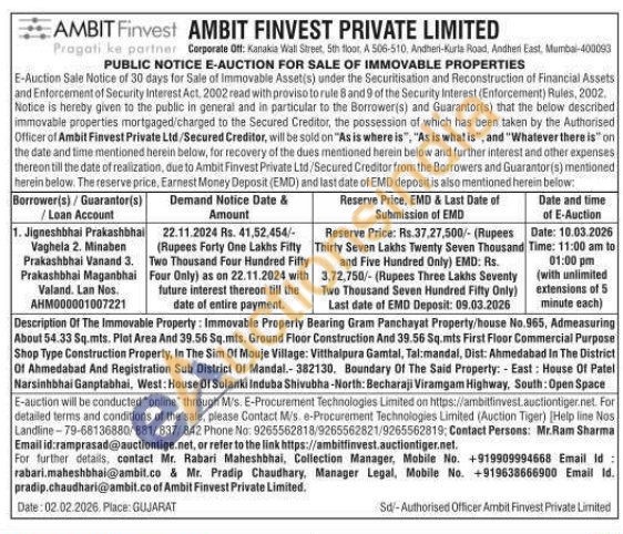 Description Of The Immovable Property: Immovable Property Bearing Gram Panchayat Property/house No.965, Admeasuring About 54.33 Sq.mts. Plot Area And 39.56 Sq.mts. Ground Floor Construction And 39.56 Sq.mts First Floor Commercial Purpose Shop Type Construction Property, In The Sim Of Mouje Village: Vitthalpura Gamtal, Tal:mandal, Dist: Ahmedabad In The District Of Ahmedabad And Registration Sub District Of Mandal.-382130, Boundary Of The Said Property: East: House Of Patel Narsinhbhai Ganptabhai, West: House Of Solanki Induba Shivubha-North: Becharaji Viramgam Highway, South: Open Space