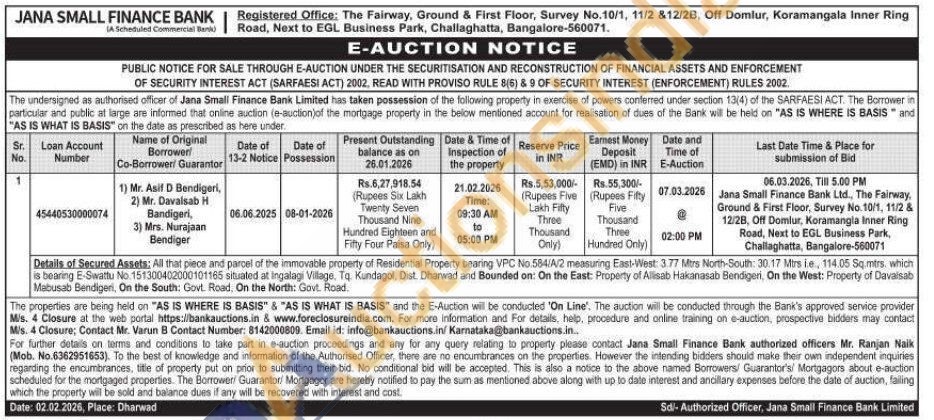 Details of Secured Assets: All that piece and parcel of the immovable property of Residential Property bearing VPC No.584/A2 measuring East-West: 3.77 Mtrs North-South: 30.17 Mirs ie, 114.05 Sq.mtrs, which is bearing E-Swattu No. 151300402000101165 situated at ingalagi Village, Tq. Kundagol, Dist. Dharwad and Bounded on: On the East: Property of Allisab Hakanasab Bendigeri, On the West: Property of Davaisab Mabusab Bendigeri, On the South: Govt. Road, On the North: Govt. Road.
