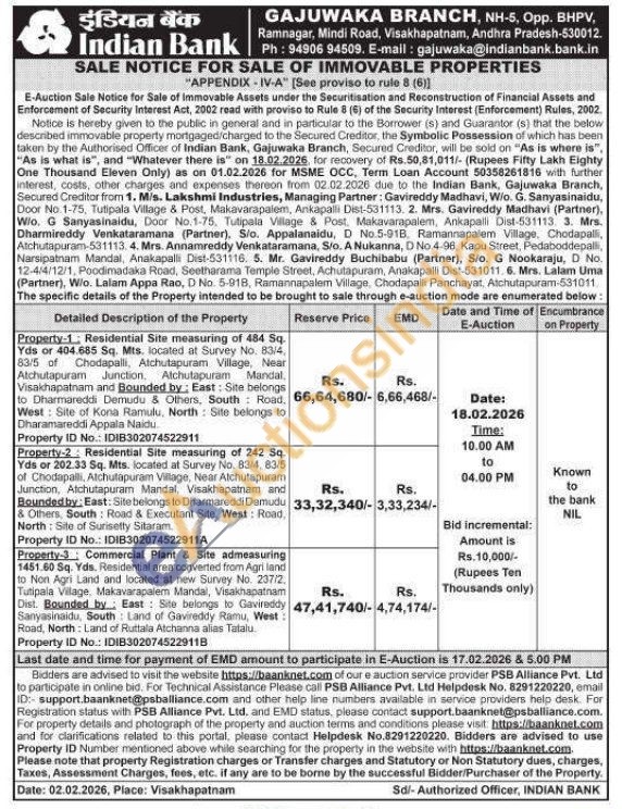 Property 1 Residential Site measuring of 484 Sq. Yds or 404.685 Sq. Mts, located at Survey No. 83/4, 83/5 of Chodapalli, Atchutapuram Village, Near Atchutapuram Junction. Atchutapuram Mandal, Visakhapatnam and Bounded by: East: Site belongs to Dharmareddi Demudu & Others, South Road, West: Site of Kona Ramulu, North Site belongs to Dharamareddi Appala Naidu