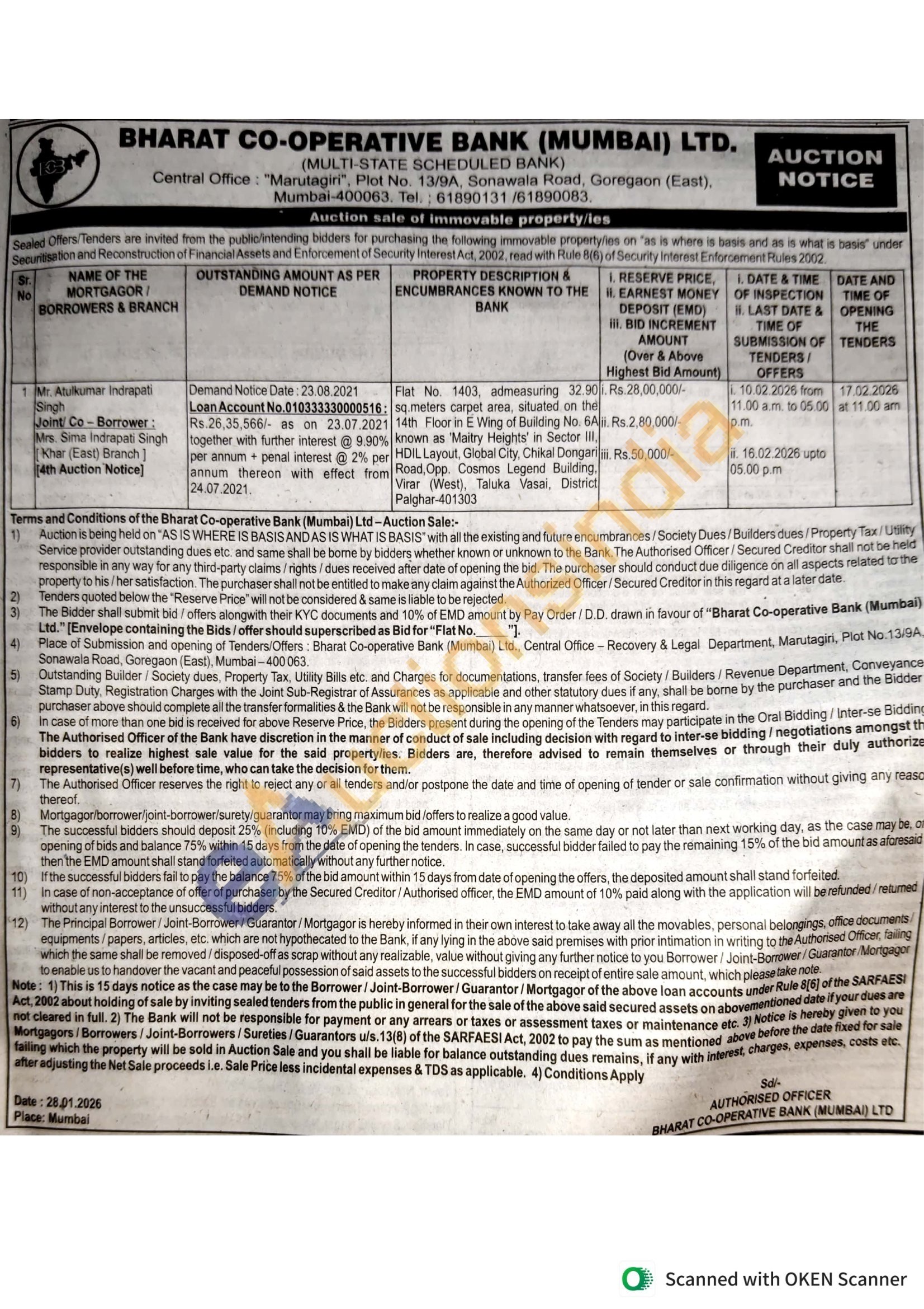 Flat No. 1403, admeasuring 32.901 sq.meters carpet area, situated on the 14th Floor in E. Wing of Building No. 6Alji. known as 'Maitry Heights in Sector Ill. HDIL Layout, Global City, Chikal Dongari Road, Opp. Cosmos Legend Building. Virar (West), Taluka Vasai, District Palghar-401303