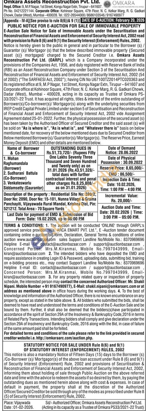 Description of the property: Residential Site No: 599/2, Door No: 2090, Door No: 15-101, Nunna Village & Grama Panchayiti, Vijayawada Rural Mandal, Krishna Dist, Pin: 521212. Total Area:-70 Square Yards