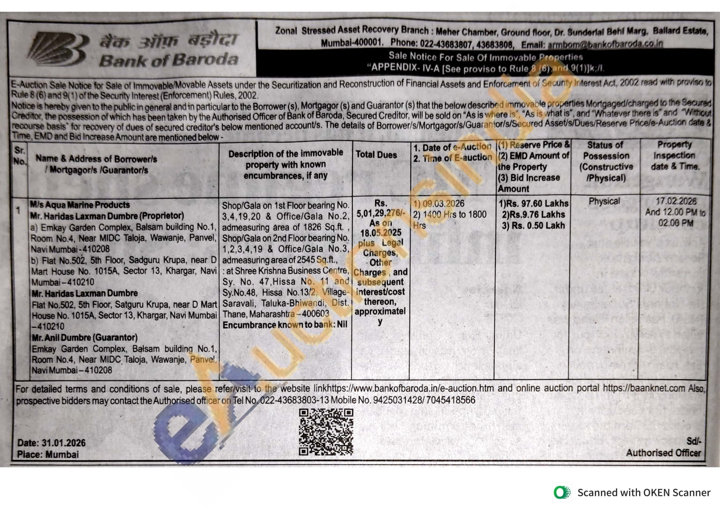 Shop/Gala on 1st Floor bearing No. 3,4,19,20 & Office/Gala No.2, admeasuring area of 1826 Sq.ft., Shop/Gala on 2nd Floor bearing No. 1,2,3,4,19 & Office/Gala No.3, Dadmeasuring area of 2545 Sq.ft., at Shree Krishna Business Centre, Sy. No. 47, Hissa No. 11 and Sy.No.48, Hissa No. 13/2, Village-Saravali, Taluka-Bhiwandi, Dist. Thane, Maharashtra-400603 Encumbrance known to bank: Nil