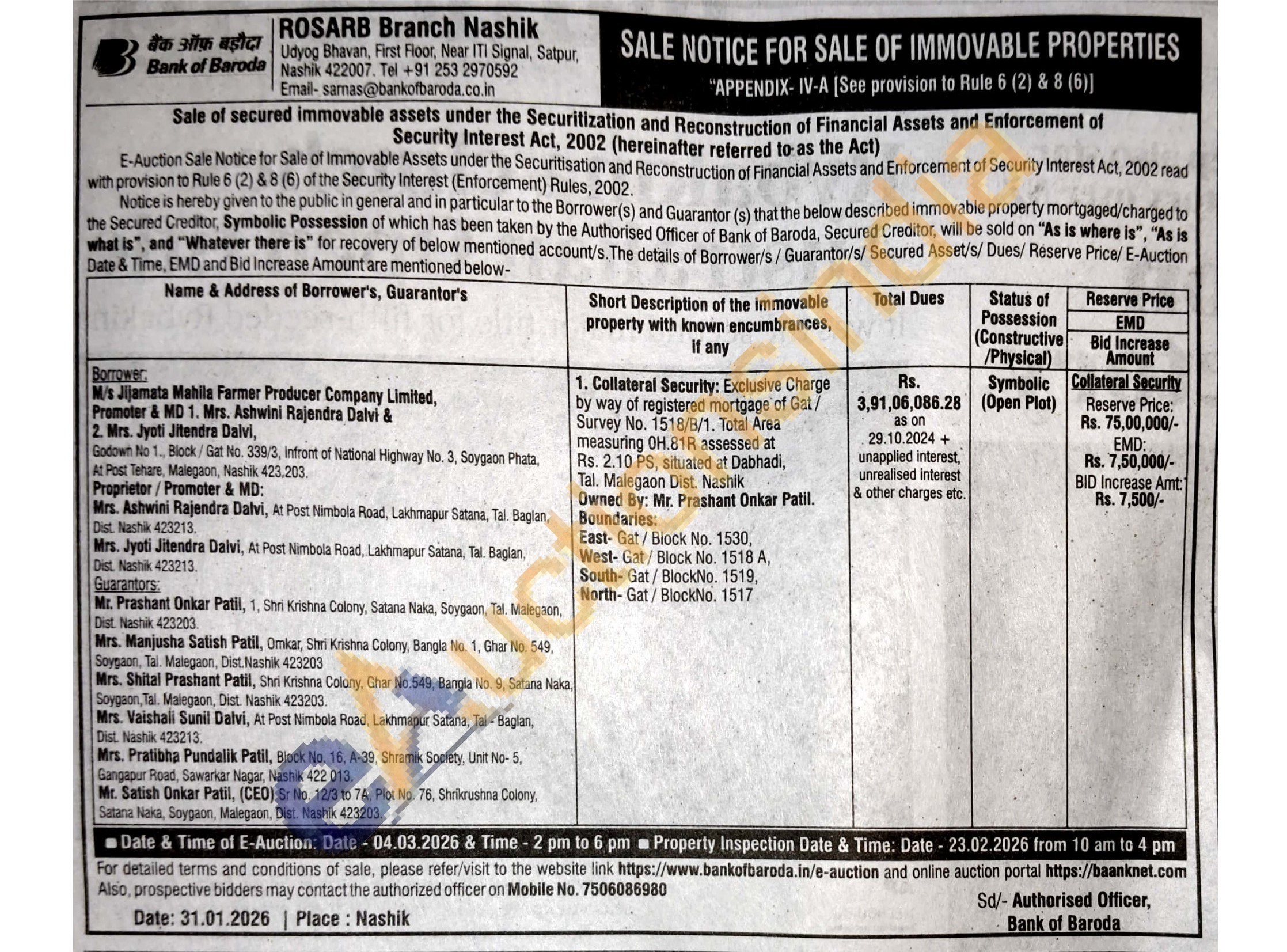 1. Collateral Security: Exclusive Charge by way of registered mortgage of Gat/ Survey No. 1518/B/1. Total Area measuring OH.81R assessed at Rs. 2.10 PS, situated at Dabhadi, Tal. Malegaon Dist. Nashik Owned By: Mr. Prashant Onkar Patil. Boundaries: East-Gat/Block No. 1530, West-Gat/Block No. 1518 A, South-Gat/BlockNo. 1519, North-Gat/BlockNo. 1517