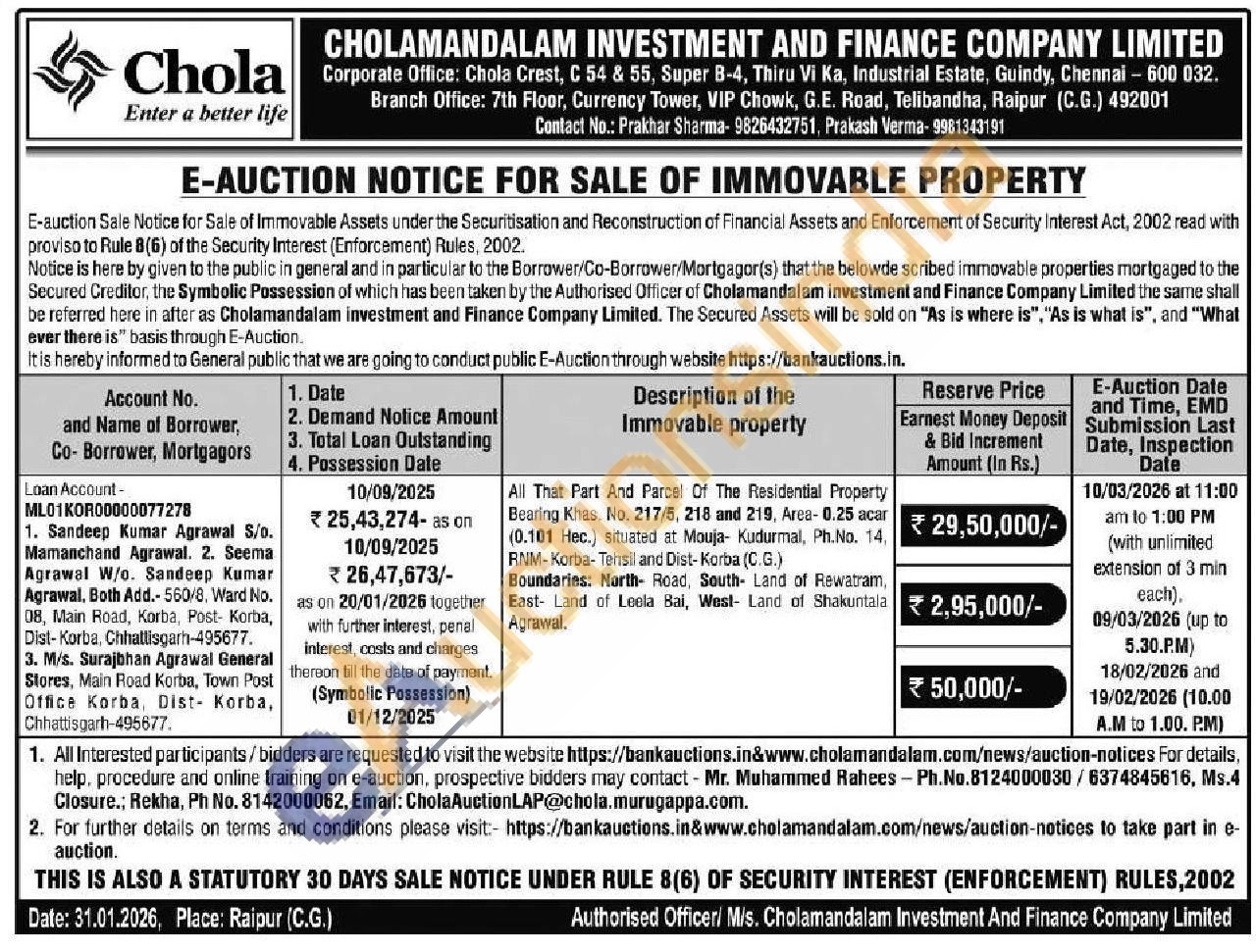 All That Part And Parcel Of The Residential Property Bearing Khas. No. 217/5, 218 and 219, Area-0.25 acar (0.101 Hec.) situated at Mouja- Kudurmal, Ph.No. 14, RNM-Korba-Tehsil and Dist-Korba (C.G.) Boundaries: North Road, South- Land of Rewatram, East- Land of Leela Bai, West- Land of Shakuntala Agrawal.