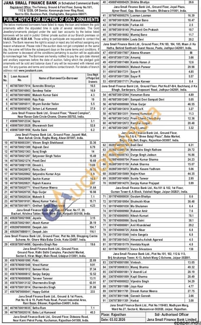 Jana Small Finance Bank Gold Auctions Auction in Bengaluru