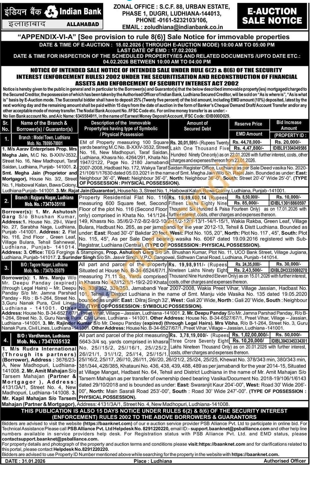 EM of Property measuring 100 Square yards bearing M.C No. B-XXIV-3532, Street No. 16, New Madhopuri, Taraf Saidan, Ludhiana, Khasra No. 4264/291, Khata No. 1947/2122, Page No. 2180 Jamabandi 2007-2008, Hadbast No. 172, Wakya Taraf Saidan Register Office, Ludhiana as per Sale Deed vasika No. 2020 21/106/1/17630 dated 05.03.2021 in the name of Smt. Megha Jain W/o Sh. Rajat Jain. Bounded as under: Eas Neighbour 36'-0", West: Neighbour 36'-0", North: Neighbour 36'-0", South: Street 20'-0" Wide 25'-0". (ΤΥΡ OF POSSESSION: PHYSICAL POSSESSION).