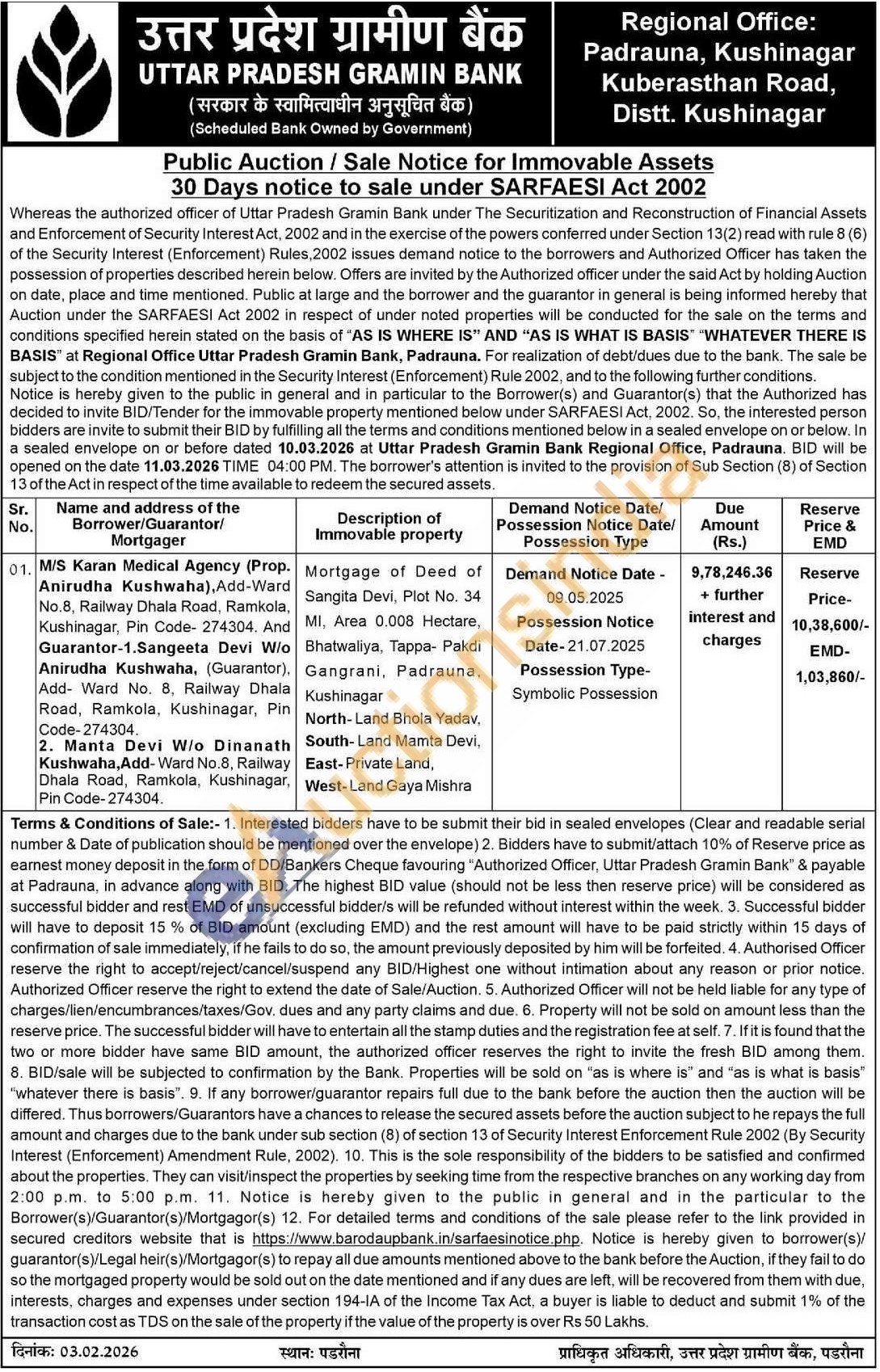 Mortgage of Deed of Sangita Devi, Plot No. 34 MI, Area 0.008 Hectare, Bhatwaliya, Tappa- Pakdi Gangrani, Padrauna. Kushinagar