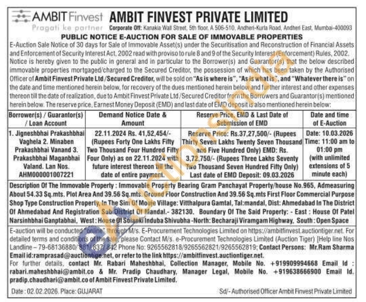 Description Of The Immovable Property: Immovable Property Bearing Gram Panchayat Property/house No.965, Admeasuring About 54.33 Sq.mts. Plot Area And 39.56 Sq.mts. Ground Floor Construction And 39.56 Sq.mts First Floor Commercial Purpose Shop Type Construction Property, In The Sim Of Mouje Village: Vitthalpura Gamtal, Tal:mandal, Dist: Ahmedabad In The District Of Ahmedabad And Registration Sub District Of Mandal.-382130. Boundary Of The Said Property: - East: House Of Patel Narsinhbhai Ganptabhai, West: House Of Solanki Induba Shivubha-North: Becharaji Viramgam Highway, South: Open Space