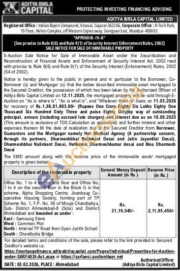 Office No. 1 to 4 on the first floor and Office No. 1 to 4 on the second floor in the Block G in the scheme, Alpha Shopping Centre, Jivanbaug Co-operative Housing Society, forming part of TP Scheme No. 1, F.P. No. 38 of Mouje Chandlodiya, Sub-District Ahmedabad-8 (Sola) and District Ahmedabad and bounded as under: