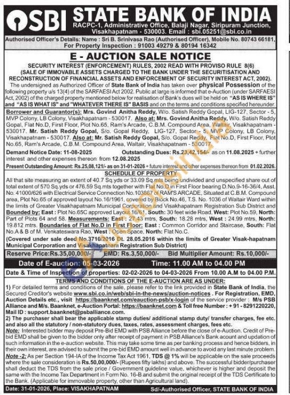 All that site measuring an extent of 40.7 Sq.yds or 33.09 Sq.mts being undivided and unspecified share out of total extent of 570 Sq.yds or 476.59 Sq.mts together with Flat No.D in First Floor bearing D.No.9-16-36/4, Asst. No. 41000/626 with Electrical Service Connection No. 103867 of RAM'S ARCADE, Situated at C.B.M. Compound area, Plot No. 65 of approved layout No. 16/1961, covered by Block No.46, T.S. No. 1036 of Waltair Ward within the limits of Greater Visakhapatnam Municipal Corporation and Visakhapatnam Registration Sub District and Bounded by: East: Plot No.65C approved Layout 16/61, South: 30 feet wide Road, West: Plot No. 59, North: Part of Plots 64 and 58. Measurements: East: 27.43 mtrs, South: 18.28 mirs, West: 24.99 mtrs, North: 19.812 mtrs. Boundaries of Flat No.D in First Floor: East: Common Corridor and Staircase, South: Flat No.A & B of M. Venkateswara Rao, West: Open Space, North: Flat No.C.