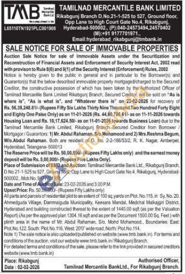All parts and parcels of residential plot to an extent of 100 sq yards on Plot. No. 115. in Sy, No. 20, Ahmedguda Village, Dammaiguda Municipality, Keesara Mandal, Medchal Malkajgiri District, Hyderabad and building constructed thereat to the extent of 1440.00 sqft (as per the Valuation Report) (As per the approved plan 1304.16 sqft and as per the Document 1500.00 Sq. Feet) with plinth area in the name of Mr. Abdul Rahaman, S/o. Mohd Mohamood., Boundaries: East: Plot No. 122. South: Plot No. 116, West: 2010' wide road, North: Plot No. 114.