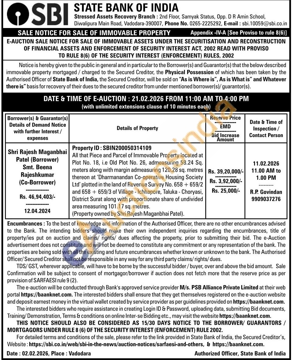 Property ID: SBIN200050314109 : All that Piece and Parcel of Immovable Property located at Plot No. 18, i.e Old Plot No. 26, admeasuring 58.24 Sq. meters along with margin admeasuring 120.28 sq. metres thereon at 'Dharmanandan Co-operative Housing Society Ltd' plotted in the land of Revenue Survey No. 658 +659/2 and 658 + 659/3 of Village - Ichhapore, Taluka - Choryasi, District Surat along with proportionate share of undivided area measuring 101.17 sq. metres