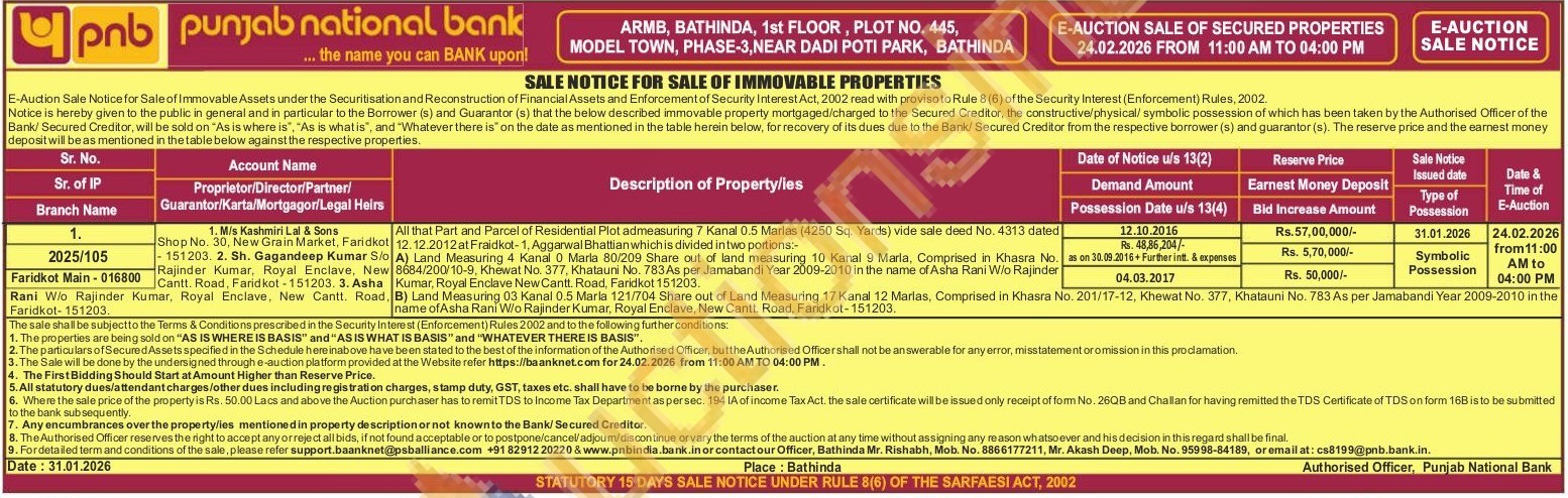 Officer. Bathinda Mr. Rishabh, Mobile No : 8866177211 / Mr. Akash Deep Mobile No : 9599884189
