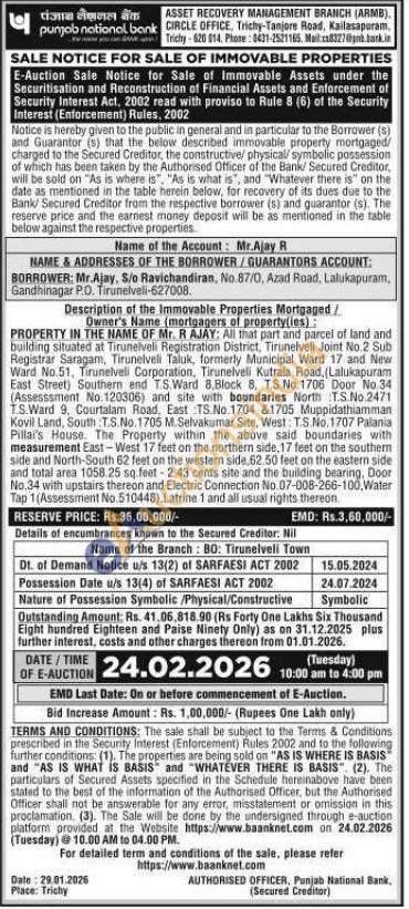 Description of the Immovable Properties Mortgaged/Owner's Name (mortgagers of property(ies): PROPERTY IN THE NAME OF Mr. R AJAY; All that part and parcel of land and building situated at Tirunelveli Registration District, Tirunelveli Joint No.2 Sub Registrar Saragam, Tirunelveli Taluk, formerly Municipal Ward 17 and New Ward No.51, Tirunelveli Corporation, Tirunelveli Kutrala Road, (Lalukapuram East Street) Southern end TS. Ward 8,Block 8, T.S.No. 1706 Door No.34 (Assesssment No.120306) and site with boundaries North T.S.No.2471 T.S.Ward 9, Courtalam Road, East TS.No.1704 &1705 Muppidathiamman Kovil Land, South: T.S.No. 1705 M.Selvakumar Site, West: T.S.No. 1707 Palania Pillai's House. The Property within the above said boundaries with measurement East-West 17 feet on the northern side, 17 feet on the southern side and North-South 62 feet on the western side, 62.50 feet on the eastern side and total area 1058.25 sq.feet-2.43 cents site and the building bearing, Door No.34 with upstairs thereon and Electric Connection No. 07-008-266-100, Water Tap 1(Assessment No.510448), Latrine 1 and all usual rights thereon