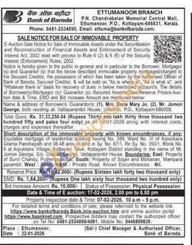 Short description of the immovable property with known encumbrances, if any; Equitable mortgage of residential building having No. 389, Ward No. Vi of Arpookara Grama Panchayash and 06:48 ares of land in Sy. No. 67/1, Re Sy. No. 350/1, Block No. 6 at Arpukkara Village, Kottayam Taluk, Kottayam District standing in the name of Mr. Jomon George, Sio. Chacko George, Vattaparambil House. Boundaries: East: Property of Sunil Chandy, Puthenpurackal; South: Property of Sojan and Mohanan, Mampara parambil, West Road, North Private Road. Known Encumbrances Nil.