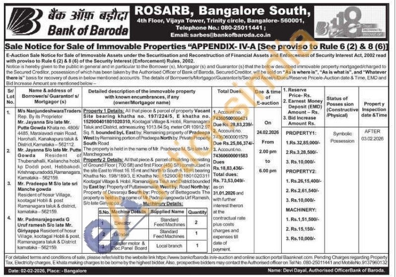 Property 2 Details: All that piece & parcel of building consisting of Ground Floor (700 Sft) and first Floor (450 Stt) constructed in the site East to West 16. 165 mt and North to South 6. 10mt bearing Khatha No. 198/189/3, E Khatha No. 152900401801020311 Kootagal Village & Hobili, Ramanagara Taluk and District bounded by East by: Property of Puttaswamaiah West by: Road North by: Property of Devaraju South by: Property of Bettegowds The property is held in the name of Mr. Padmarajegowda Urf Ramesh, 8/o late Giriyappa