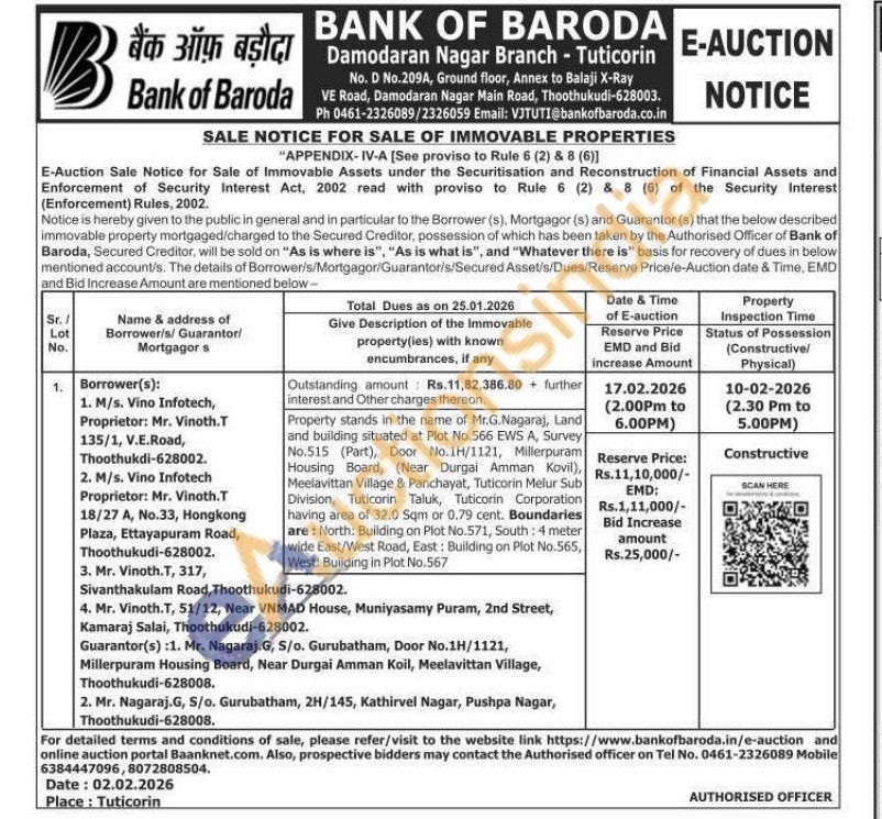 Property stands in the name of Mr.G.Nagaraj, Land and building situated at Plot No.566 EWS A, Survey No.515 (Part), Door No.1H/1121, Millerpuram Housing Board, (Near Durgai Amman Kovil), Meelavittan Village & Panchayat, Tuticorin Melur Sub Division, Tuticorin Taluk, Tuticorin Corporation having area of 32.0 Sqm or 0.79 cent. Boundaries are: North: Building on Plot No.571, South: 4 meter wide East/West Road, East: Building on Plot No.565, West: Building in Plot No.567