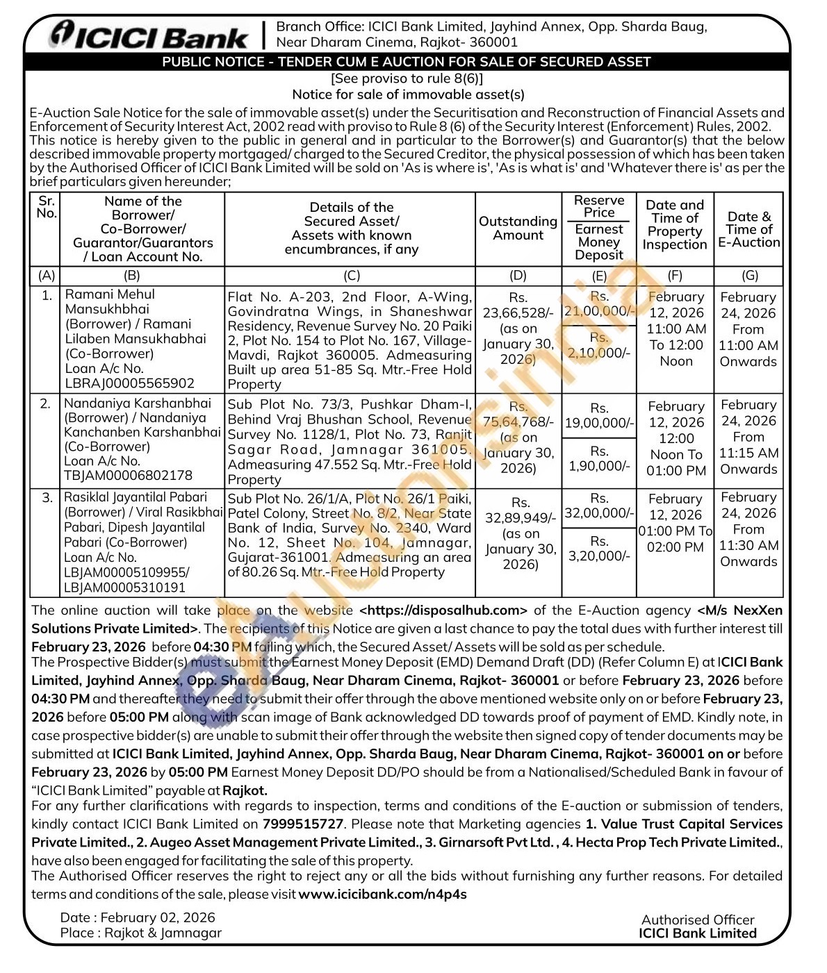 Flat No. A-203, 2nd Floor, A-Wing, Govindratna Wings, in Shaneshwar Residency, Revenue Survey No. 20 Paiki 2, Plot No. 154 to Plot No. 167, Village-Mavdi, Rajkot 360005. Admeasuring Built up area 51-85 Sq. Mtr.-Free Hold Property