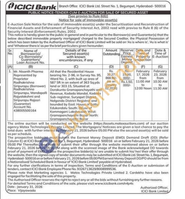 All that the Residential House bearing No. 2-96, in Survey No. 95, Ward No. 2, with built up area of 587 Sft in an extent of 363 Sq.yds land or 303.15, Situated at Dorakunta Gramapanchayathi and Revenue, Kodada Mandal, Kodada Sub-registrar, Suryapet District. Nolgonda District Registrar and bounded by East: House of Sattu Edukondalu South: House of Kommagani Lakshmaiah West: Gramapanchayathi Bazar North: Gramapanchayathi Bazar