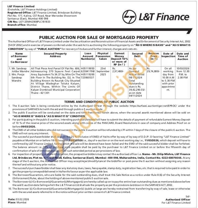 All That Piece And Parcel Of Flat No. 606, Admeasuring 370 Sqaure Feet Carpet Area, Equivalent To 34.37 Sq. Mtrs On The 6th Floor In The Building No. D2, In The Building Known As Raunak City Situated At Village Wadeghar Taluka Kalyan, District Thane, Within The Limits Of Kalyan Dombivali Municipal Corporation Thane-421301