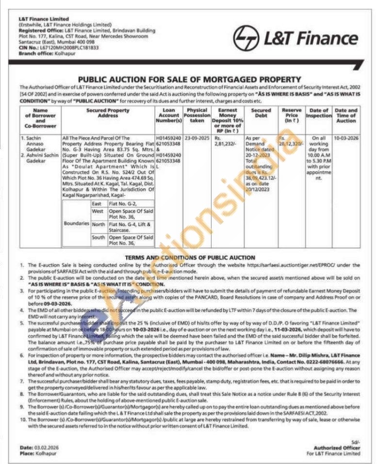 All The Piece And Parcel Of The Property Address Property Bearing Flat No. G-3 Having Area 83.75 Sq. Mtrs. & (Super Built-Up) Situated On Ground Floor Of The Apartment Building Known As "Doulat Apartment Which is L Constructed On R.S. No. 524/2 Out Of Which Plat No. 36 Having Area 474.69 5q. Mtrs. Situated At K. Kagal, Tal. Kagal, Dist. Kolhapur & Within The Jurisdiction Of Kagal Nagarparishad, Kagal-