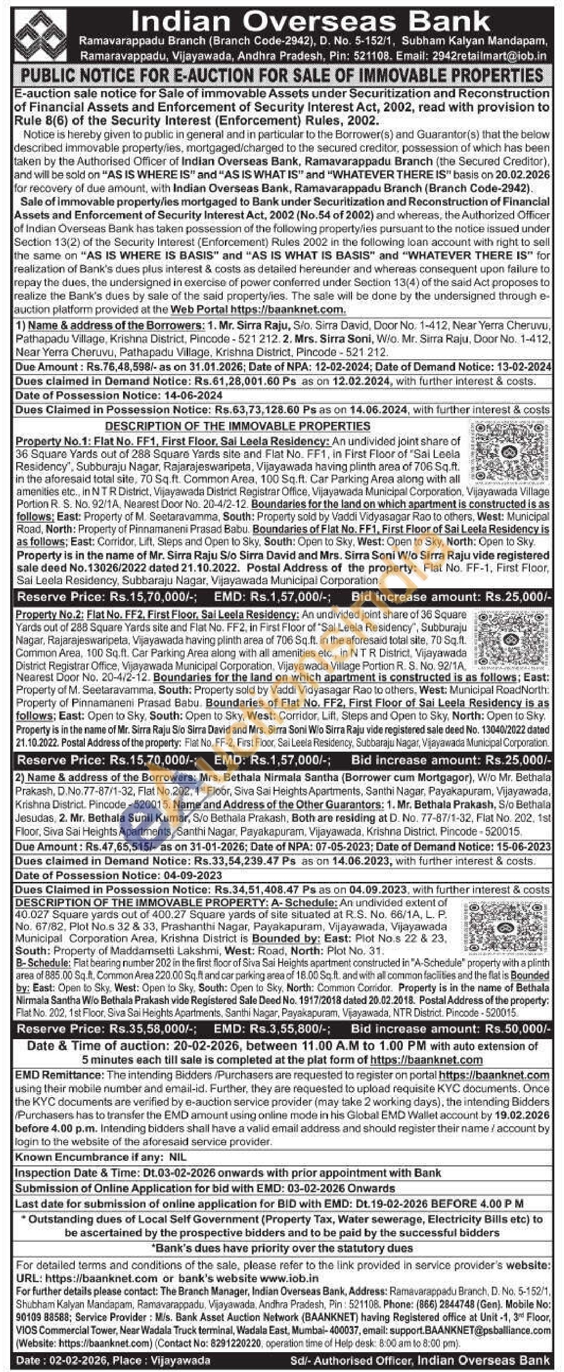 Flat No. FF2, First Floor, Sai Leela Residency: An undivided joint share of 36 Square Yards out of 288 Square Yards site and Flat No. FF2, in First Floor of "Sal Leela Residency", Subburaju Nagar, Rajarajeswaripeta, Vijayawada having plinth area of 706 Sq.ft. in the aforesaid total site, 70 Sq.ft. Common Area, 100 Sq.ft. Car Parking Area along with all amenities etc., in NTR District, Vijayawada District Registrar Office, Vijayawada Municipal Corporation, Vijayawada Village Portion R. S. No. 92/1A, Nearest Door No. 20-4/2-12. Boundaries for the land on which apartment is constructed is as follows; East: Property of M. Seetaravamma, South: Property sold by Vaddi Vidyasagar Rao to others, West: Municipal Road North: Property of Pinnamaneni Prasad Babu. Boundaries of Flat No. FF2, First Floor of Sai Leela Residency is as follows; East: Open to Sky, South: Open to Sky, West: Corridor, Lift, Steps and Open to Sky, North: Open to Sky. Property is in the name of Mr. Sirra Raju Sio Sirra David and Mrs. Sirra Soni Wio Sirra Raju vide registered sale deed No. 13040/2022 dated 21.10.2022. Postal Address of the property: Flat No. FF-2, First Floor, Sai Leela Residency, Subbaraju Nagar, Vijayawada Municipal Corporation.