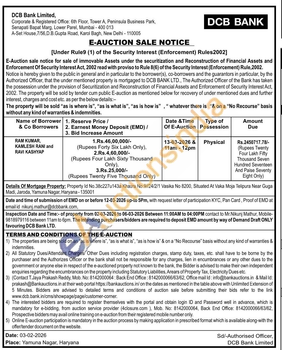 Details Of Mortgage Property: Property Id No.38c227u143a Khasra No.9//24/2/1 Vasika No 8200, Situated At Vaka Moja Telipura Near Guga Madi, Jaroda, Yamuna Nagar, Haryana-135001