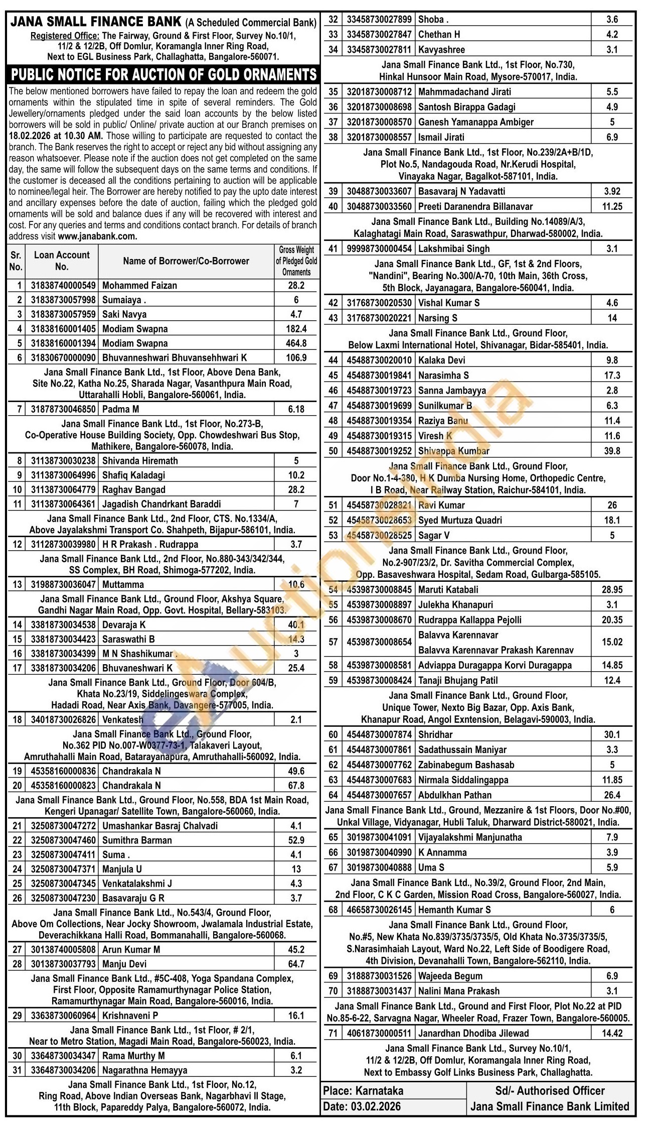 Jana Small Finance Bank Gold Auctions Auction in Bengaluru