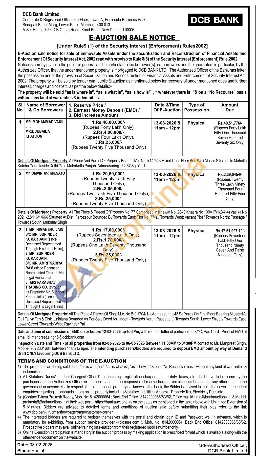 Details Of Mortgage Property: All Piece And Parcel Of Property Bearing Mic No-b 14/543 Mixed Used Near Beri Wali Masjid Situated In Mohalla Kalcha Court inside Delhi Gate Maierkotla Punjab-Admeasuring-64.67 Sq. Yard