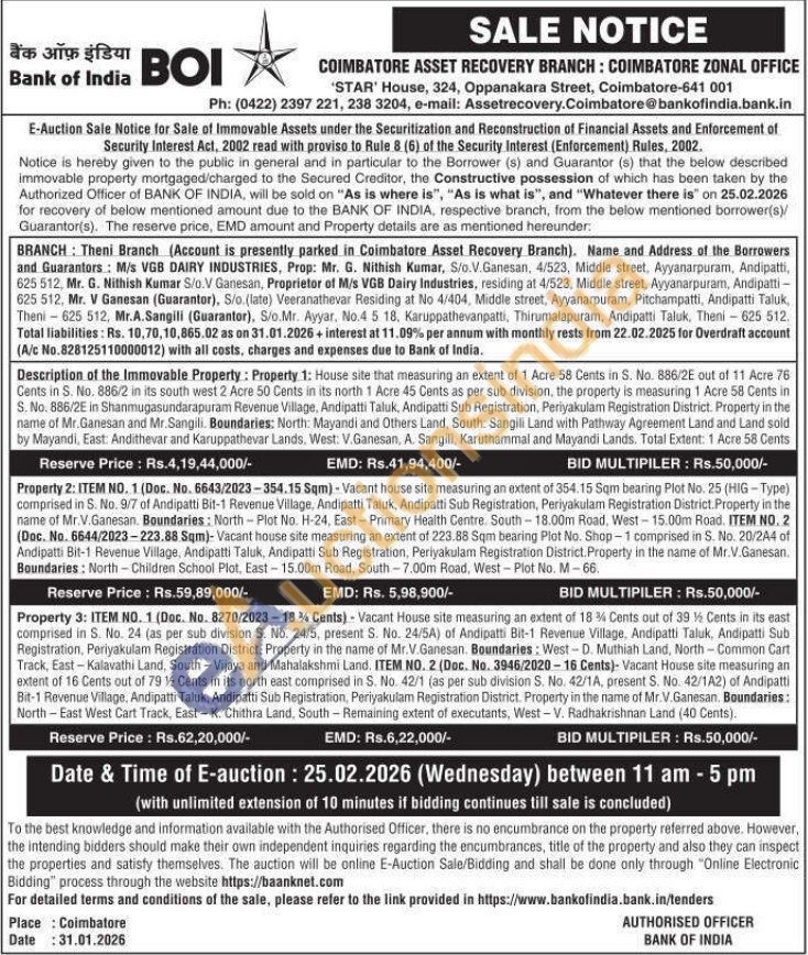 Description of the Immovable Property: Property 3: ITEM NO. 1 (Doc. No. 8270/2023-18% Cents) - Vacant House site measuring an extent of 18% Cents out of 39 % Cents in its east comprised in S. No. 24 (as per sub division S. No. 24/5, present S. No. 24/5A) of Andipatti Bit-1 Revenue Village, Andipatti Taluk, Andipatti Sub Registration, Periyakulam Registration District. Property in the name of Mr.V.Ganesan. Boundaries: West-D. Muthiah Land, North Common Cart Track, East-Kalavathi Land, South-Vijaya and Mahalakshmi Land. ITEM NO. 2 (Doc. No. 3946/2020-16 Cents)- Vacant House site measuring an extent of 16 Cents out of 79 1½ Cents in its north east comprised in S. No. 42/1 (as per sub division S. No. 42/1A, present S. No. 42/1A2) of Andipatti Bit-1 Revenue Village, Andipatti Taluk, Andipatti Sub Registration, Periyakulam Registration District. Property in the name of Mr.V. Ganesan. Boundaries: North-East West Cart Track, East-K. Chithra Land, South-Remaining extent of executants, West-V. Radhakrishnan Land (40 Cents)