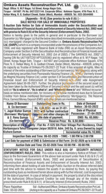 Description of the property: Flat No-F-525 5th Floor Village Pari Residency, Chak Harbanspura Tehsil Sanganer Jaipur 302018. Adm. 340 Sq. ft. area. Owned by Jugal Kishore Suman