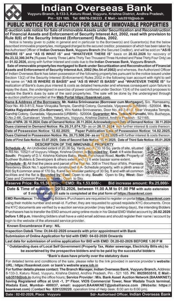Schedule-A: An Undivided extent of 20.36 Sq. Yards out of 733.16 Sq. yards of site, situated in RS No. 1052/1 of Vuyyuru Village, Krishna District, is Bounded by: East: 4 ft wide Bazaar, South: Property of D.V. Krishna Kishore Babu, West: Panchayat Road, North: Property of Sudheer Builders & Developers & others extent and 12 ft wide bazaar some extent. Schedule-B: All that the piece and parcel of the Flat No. 306 in Third floor of M/s. Prameela Residency Block No.1 apartments constructed in A- Schedule property, with a plinth area of 800 Sq ft common area of 170 Sq. ft and two wheeler parking of 30 Sq. ft and with all common facilities and the flat is Bounded by: East: Open to sky, South: Open to Sky, West: Stair Case and Common Passage, North: Open to Sky.