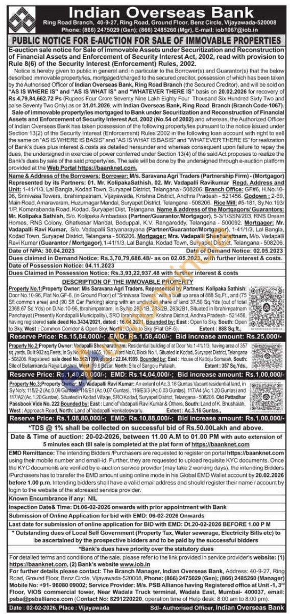 Property No.2 Property Owner: Vadapalli Shesharattnam: Residential building of at Door No 1-41/10, having area of 357 sq yards Bull 502 sq Feets. Is Sy No. 1064, 1065, 1006. Ward No. Block No. 1, Situated in kodad, Suryapet Dist, Telangana 508206 Registered sale deed No.562/1999, dated: 22.04.1999. Bounded by: East: House of Kattoju Somaiah, South Ste of Bellamikorda Rajya Lakshmi, West: 19.8-Bazar, North: Site of Sango Pullaiah Extant: 357 Sq. Yds