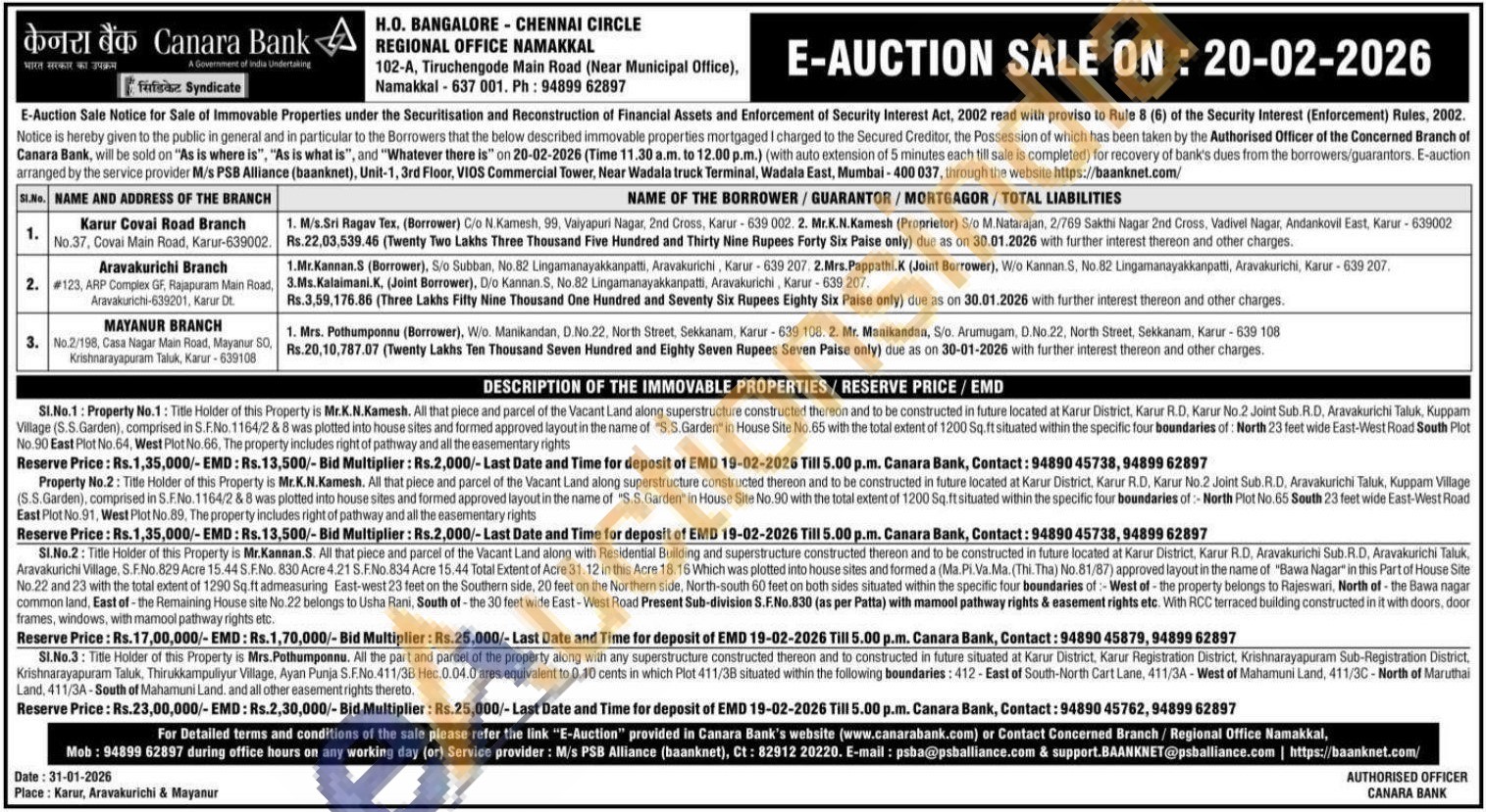 SI.No.1: Property No.1: Title Holder of this Property is Mr.K.N.Kamesh. All that plece and parcel of the Vacant Land along superstructure constructed thereon and to be constructed in future located at Karur District, Karur R.D. Karur No.2 Joint Sub.R.D. Aravakurichi Taluk, Kuppam Village (S.S.Garden), comprised in S.F.No 1164/2 & 8 was plotted into house sites and formed approved layout in the name of "S.S.Garden" in House Site No. 65 with the total extent of 1200 Sq.ft situated within the specific four boundaries of: North 23 feet wide East-West Road South Plot No.90 East Plot No. 54, West Plot No. 66, The property includes right of pathway and all the easementary rights