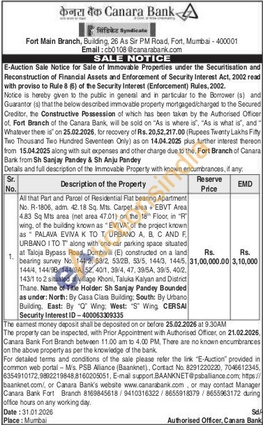 All that Part and Parcel of Residential Flat bearing Apartment No. R-1806, adm. 42.18 Sq. Mts. Carpet area + EBVT Area 4.83 Sq Mts area (net area 47.01) on the 18th Floor, in "R" wing, of the building known as "EVIVA" of the project known as PALAVA EVIVA K TO T, URBANO A, B, C AND F URBANO I TO T™ along with one car parking space situated at Taloja Bypass Road, Dombivili (E) constructed on a land bearing survey No. 144/2, 53/2, 53/28, 53/5, 144/3, 144/5, 1444, 144/98, 144/9A, 52, 40/1, 39/4, 47, 39/5A, 39/5, 40/2, 143/1 to 2 situated at village Khoni, Taluka Kalyan and District Thane. Name of Title Holder: Sh Sanjay Pandey Bounded as under: North: By Casa Clara Building, South: By Urbano Building, East: By "Q" Wing: West: "S" Wing CERSAI Security Interest ID-400063309335