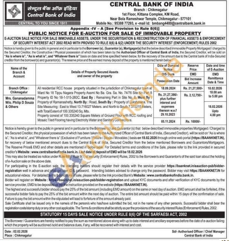All residential RCC house property situated in the jurisdiction of Chikmagalur town at Ward No 18 Tippu Nagara Property Assmi No Ba. Gra. Sa. No. 74/76 Site No Part 8 Property ID No 18-1-515-260C. East By: Remaining Part in Site No. 8, West By: Property of Ramanashetty, North By: Road, South By: Property of Lakshmana. The Site Measuring: East to West 13.716027 Meters and North to South 7.315215 Meters, with Total Extent of 100.335240 Sq. Mts.