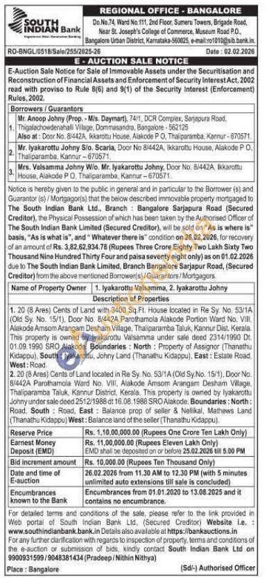 1. 20 (8 Ares) Cents of Land with 3400 Sq.Ft. House located in Re Sy. No, 53/1A (Old Sy. No. 15/1), Door No. 8/442A Parothamola Alakode Portion Ward No. VIII, Alakode Amsom Arangam Desham Village, Thaliparamba Taluk, Kannur Dist. Kerala. This property is owned by lyakarottu Valsamma under sale deed 2314/1990 D 01.09.1990 SRO Alakode Boundaries: North: Property of Assignor (Thanathu Kidappu), South: lyakarottu, Johny Land (Thanathu Kidappu), East: Estate Road West: Road. 2. 20 (8 Ares) Cents of Land located in Re Sy. No. 53/1A (Old Sy.No. 15/1), Door No. 8/442A Parothamola Ward No. VIII, Alakode Amsom Arangam Desham Village, Thaliparamba Taluk, Kannur District, Kerala. This property is owned by lyakarottu Johny under sale deed 2512/1988 dt 16.08.1988 SRO Alakode. Boundaries: North: Road, South Road, East: Balance prop of seller & Nellikal, Mathews Land (Thanathu Kidappu) West: Balance land of the seller (Thanathu Kidappu