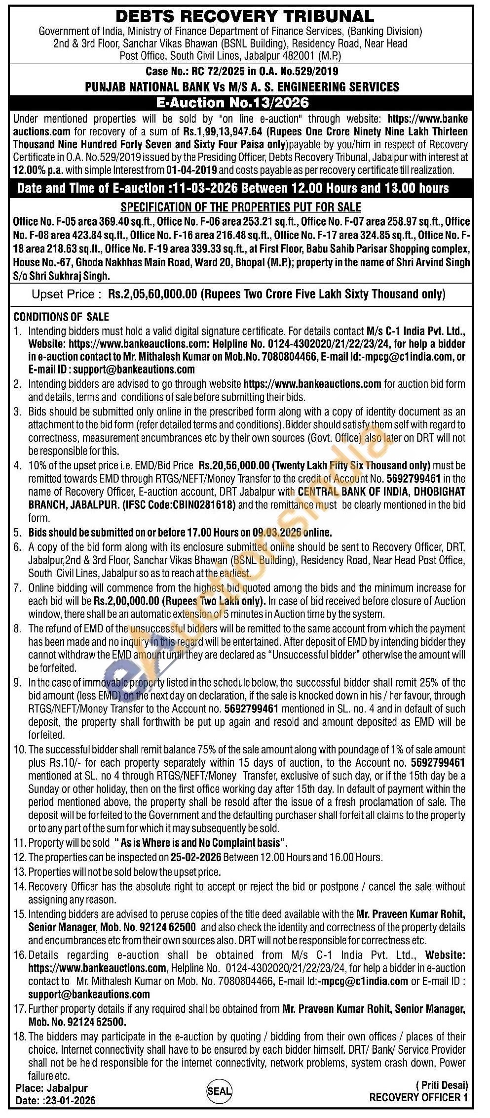 Office No. F-05 area 369.40 sq.ft., Office No. F-06 area 253.21 sq.ft., Office No. F-07 area 258.97 sq.ft., Office No. F-08 area 423.84 sq.ft.. Office No. F-16 area 216.48 sq.ft., Office No. F-17 area 324.85 sq.ft., Office No. F-18 area 218.63 sq.lt., Office No. F-19 area 339.33 sq.ft., at First Floor, Babu Sahib Parisar Shopping complex, House No.-67, Ghoda Nakhhas Main Road, Ward 20, Bhopal (M.P.); property in the name of Shri Arvind Singh S/o Shri Sukhraj Singh.