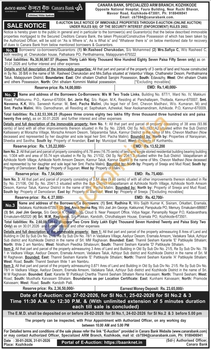 Details and full description of the immovable property: Item No. 1: All that part and parcel of property consisting of 38 ares (93.86 cents) of land with all other improvements thereon situated in Re Sy. No. 229/8, Old Sy. No. 192/1A2 situated within the Sub District Kalliassery at Morazha Village, Morazha Amsom Desom, Taliparamba Taluk, Kannur District in the name of Mrs. Chevon Madhavi (Now deceased and represented by her daughter and sole legal heir Smt. Pacha Malini). Bounded by: North by: Properties of Narayanan, Sheeba and Savitha; South by: Property of Anandan; East by: Municipal Road: West: Property of Kunhambu.