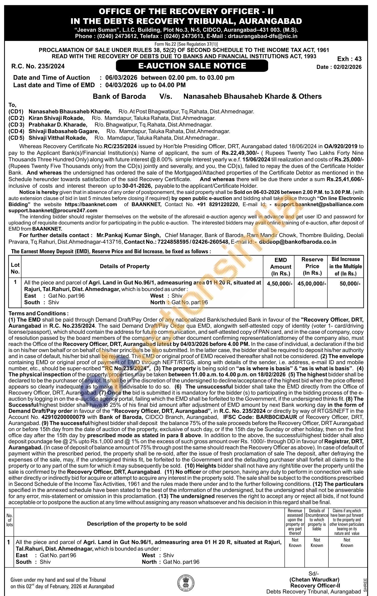 All the piece and parcel of Agri. Land in Gut No.96/1, admeasuring area 01 H 20 R, situated at Rajuri, Tal. Rahuri, Dist. Ahmednagar, which is bounded as under:East Gat No. part 96 South Shiv West: Shiv North Gat No. part