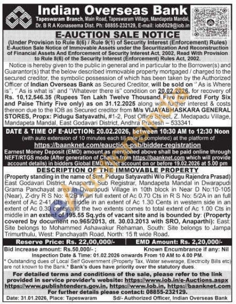 DESCRIPTION OF THE IMMOVABLE PROPERTY : (Property standing in the name of Smt. Pidugu Satyavathi W/o Pidugu Rajendra Prasad) East Godavari District, Anaparthi Sub Registrar, Mandapeta Mandal in Dwarapudi Grama Panchayat area in Dwarapudi Village in 10th block in Near D No:10-105 (Near), Z-dry RS No: 4/2B in an full extent of Ac 0.70 Cts in RS No: 5/2A in an full extent of Ac 2-41 Cts in middle in an extent of Ac 1.30 Cents in western side in an extent of Ac 0.30 cents and the two extents comes to total extent of Ac 1.00 Cts in middle in an extent of 195.55 Sq.yds of vacant site and is bounded by: (Property covered by document no.965/2013, dt. 30.03.2013 with SRO, Anaparthi): East: Site belongs to Mohammed Ashawakur Rehaman, South: Site belongs to Jampa Trimurthulu, West: Panchayath Road, North: 15 ft wide Road