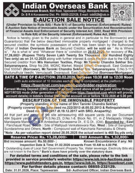 DESCRIPTION OF THE IMMOVABLE PROPERTY : (Property standing in the name of Shri Taninki Chandra Sekhar) (Property covered under Sale deed no.222/2013 dt.05.02.2013 & Relinquishment Deed no. 3565/2017 dt.19.12.2017 with SRO, Anaparthy) : All that part and parcel of the site admeasuring 468 square yards (As per Document 484 Square yards) bearing R.S.No. 23, D.No.1-8, Block No. 01. in Z Medapadu Village, Mandapeta Mandal, Dr BR Ambedkar Konaseema Dt., E G Dt., (Old). Bounded by: East Panchayat Road, South: Site of Mallipudi Venkateswara Rao, West: Site of Sangisetty Sundaramma and Others. North: Compound wall of Kancharia Ramababu & Others.