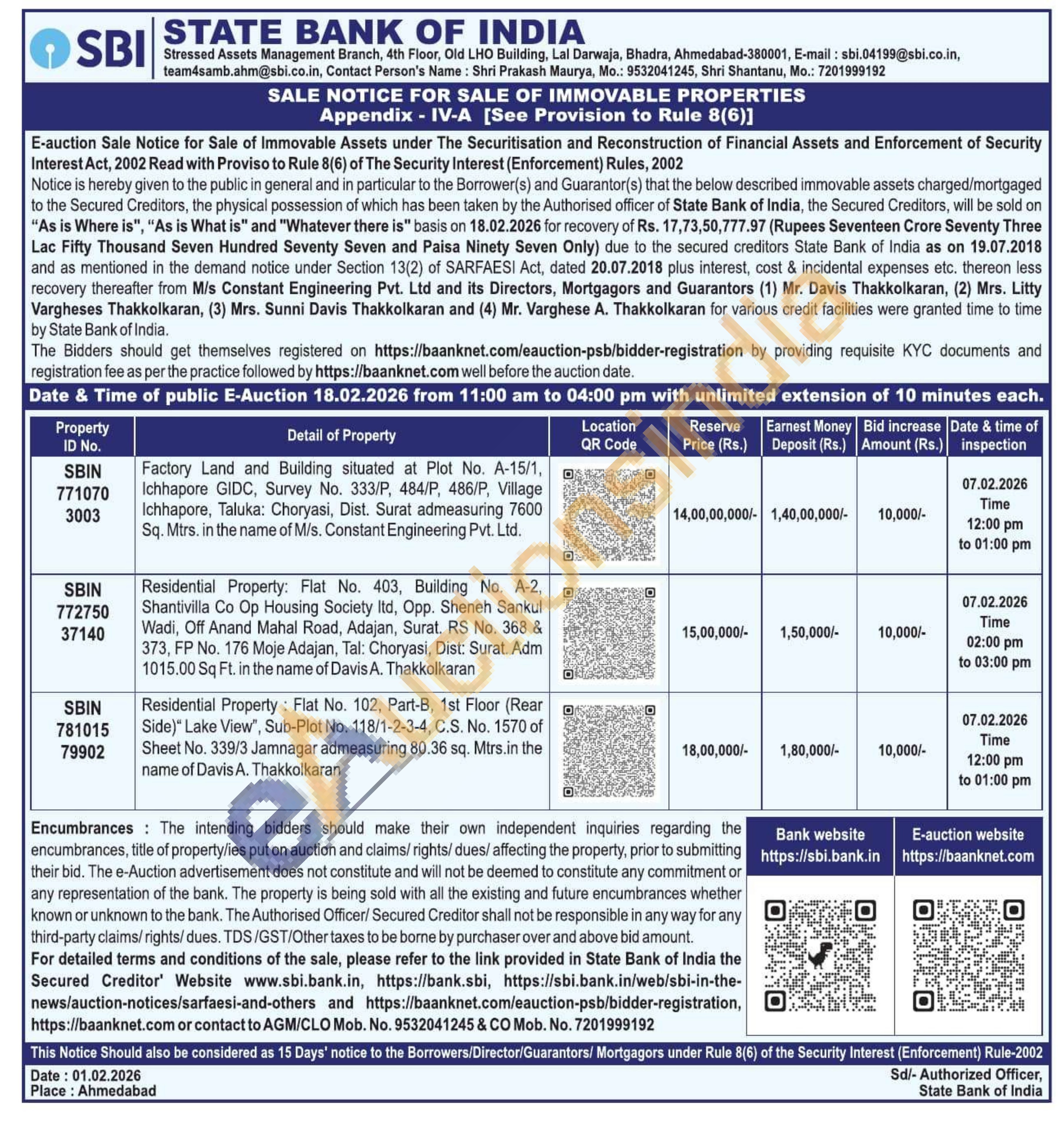 Residential Property: Flat No. 403, Building No. A-2, Shantivilla Co Op Housing Society Itd, Opp. Sheneh Sankul Wadi, Off Anand Mahal Road, Adajan, Surat. RS No. 368 & 373, FP No. 176 Moje Adajan, Tal: Choryasi, Dist: Surat. Adm 1015.00 Sq Ft. in the name of Davis A. Thakkolkaran