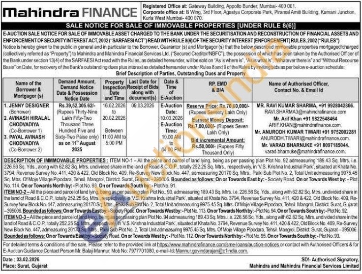ITEM NO-2-All the piece and parcel of land lying, being as per passing plan Plot No., 93, admeasuring 189.43 Sq. Mtrs. Le. 226.56 Sq. Yds., along with 62.82 Sq. Mtrs. undivided share in the land of Road & C.O.P., totally 252.25 Sq. Mtrs, respectively, in V.S. Krishna Industrial Park, situated at Khata No. 3794, Revenue Survey No. 411, 420 & 422, Old Block No. 409, Re-Survey New Block No. 447, admeasuring 20170 Sq. Mirs., Paiki Sub Plot No. 2. Total Unit admeasuring 9975.45 Sq. Mtrs. Of Moje Vilage Pipodara. Tehsil. Mangrol, District. Surat, Gujarat -395006. Bounded as follows: On or Towards East by: Society Road On or Towards Westby:-Plot No. 113. On or Towards North by:-Plot No. 94. On or Towards South by:-Plot No.92 ITEM NO-3-All the piece and parcel of land lying, being as per passing plan Plot No. 94 admeasuring 189.43 Sq. Mtrs.i.e. 226.56 Sq. Yds along with 62.82 Sq. Mtrs. undivided share in the land of Road & C.O.P, totally 252.25 Sq. Mtrs., respectively, in V.S. Krishna Industrial Park, situated at Khata No. 3794, Revenue Survey No. 411,420 & 422, Old Block No. 409, Re-Survey New Block No. 447, admeasuring 20170 Sq. Mtrs., Paiki Sub Plot No. 2. Total Unit admeasuring 9975.45 Sq. Mitrs. Of Moje Village Pipodara, Tehsil. Mangrol, District. Surat, Gujarat-395006. Bounded as follows: On or Towards East by:-Society Road. On or Towards West by:-Plot No. 112. On or Towards North by:-Plot No. 95. On or Towards South by:-Plot No. 93