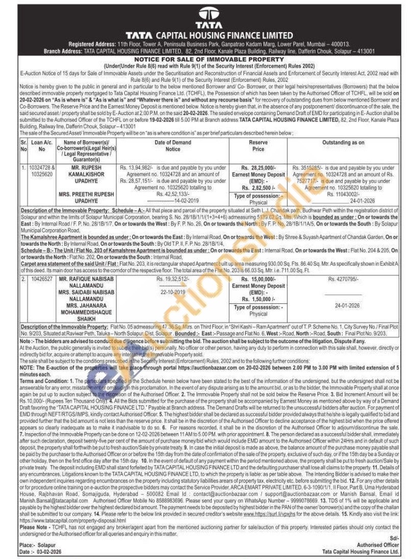 Description of the Immovable Property: Flat No. 05 admeasuring 47.36 Sq. Mtrs. on Third Floor, in "Shri Kashi-Ram Apartment out of T.P. Scheme No. 1, City Survey No/Final Plot No. 9/203, Situated at Raviwar Peth, Taluka-North Solapur, Dist Solapur Bounded East: Passage and Flat No. 6. West: Road, North: Road, South: Final Plot No. 9/203