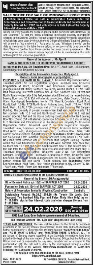Description of the Immovable Properties Mortgaged/Owner's Name (mortgagers of property(ies): PROPERTY IN THE NAME OF Mr. R AJAY: 1. Tirunelveli Registration District, Tirunelveli Joint 2 No. Sub Registratrar Saragam, Tirunelveli Taluk, Tirunelveli Corporation 51 Ward, Tirunelveli Town Courtalan Road (Azad Road), (Lalugapuram East Street) Southern row Survey Ward 8, Block 8, T.S.No. 1707 land measuring East-West northern side 40 feet, southern side 39 feet and North-South western side 6115 feet, eastern side 62 feet and the house building bearing Door Nos. 35 & 35A with electric connection, Meter Deposit, Drinking Water Pipe deposit Boundaries: North T.S. Ward 9, Courtalam Road (Azad Road), East T.S.No. 1706 North-South Pathway Land, South: T.S.No. 1705/2 land, West: T.S.No. 1708 common wall of Thirumalai Spinning Mill Sangam Building. The property at present measurement East West northern side 13.6 feet southern side 15.6 feet and North-South westerns side 52.6 feet and eastern side 52.6 feet and the House Building constructed in that land bearing Door Nos. 35 and 35A with electric connection, 2/3 share out of 3 shares belong to P Sankaran and P.Paramasivan in the above said property 2- Tirunelveli Registration District, Tirunelveli Joint 2 No. Sub Registratrar Saragam, Tirunelveli Taluk, Tirunelveli Corporation 51 Ward, Tirunelveli Town Courtalam Road (Azad Road), (Lalugapuram East Street) Southern Row T.S.No. 1707 eastern portion southern end part vacant site Boundaries: North: Sankaran land and house wall, East Common Pathway land (3rd Item), South T.S.No. 1705-No.2 land, West Common wall of Thirumalai Mills Sangam Building. The land within the said boundaries measuring East-West northern side 15.6 feet, southem side 15.6 feet and North-South western side 10 feet eastern side 10 feet and total 155 sq.feet (14.399 sq.metre) and undivided 2/3 share only. 3. Tirunelveli Registration District, Tirunelveli Joint 2 No. Sub Registratrar Saragam, Tirunelveli Taluk. Tirunelveli Corporation 51 Ward, Tirunelveli Town Courtalam Road (Azad Road), (Lalugapuram East Street) T.S.No 1707 eastern portion eastern end port North South pathway land Boundaries: North Courtalam Road (Azad Road), East: House site belongs to Ajay, South: South: T.S. No. 1705/2 land. West: 1 item land and house 2 item land