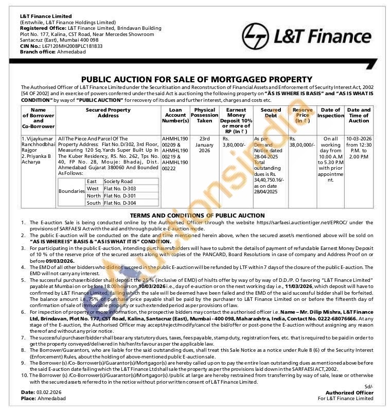 All The Piece And Parcel Of The Property Address: Flat No. D/302, 3rd Floor, Measuring 120 Sq. Yards Super Built Up In The Kuber Residency, RS. No. 262, Tps No. 40, FP No. 28, Mouje: Bhadaj, Dist. Ahmedabad Gujarat 380060